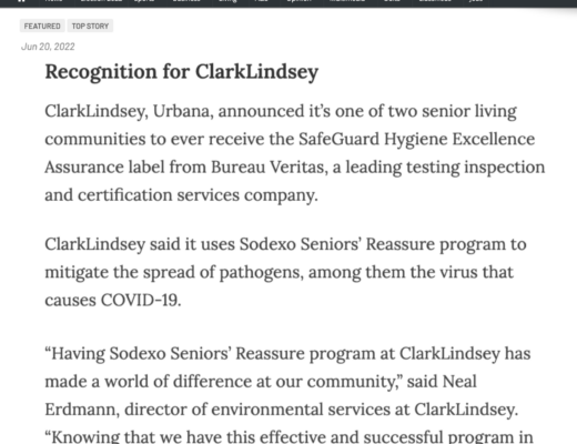 ClarkLindsey, Urbana, announced it’s one of two senior living communities to ever receive the SafeGuard Hygiene Excellence Assurance label from Bureau Veritas, a leading testing inspection and certification services company.